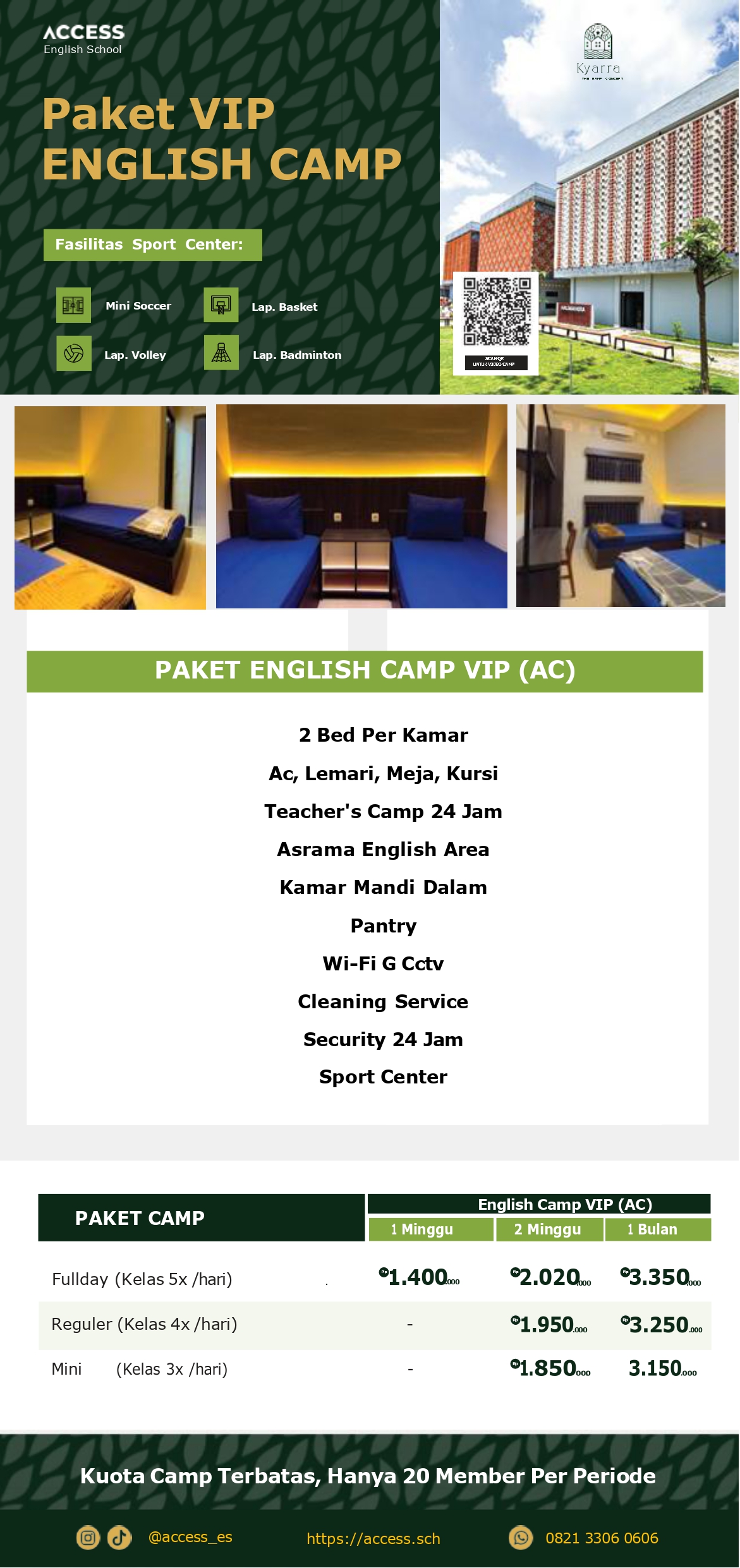 Tingkatkan kemampuan bahasa Inggris secara intensif dengan 3x kelas/pertemuan sehari. Daftar sekarang dan nikmati suasana belajar dengan lingkungan hijau dan fasilitas yang SUPER NYAMAN!